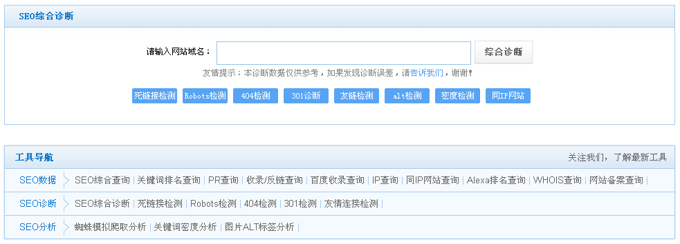 優(yōu)點(diǎn):“SEO綜合診斷”可以檢測(cè)404、301、alt標(biāo)簽等,這個(gè)是比起其他網(wǎng)站工具存在的優(yōu)點(diǎn),可以了解網(wǎng)站有多少個(gè)圖片沒(méi)有加alt標(biāo)簽,很明了。